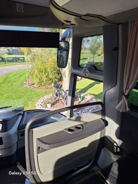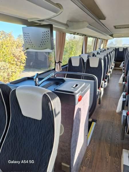 Ausstattung: WC, Kühlschrank, Küche, Leselampen, Düsenbelüftung, Gepäckablagen, ABS, ASR, Tempomat, Retarder, Navigationssystem, CD, Fußrasten, Tische, Mikrofon, Klimaanlage, Radio, Hebe-Senk-Anlage, Zentralverriegelung, Doppelverglasung, Servolenkung, elektrische Spiegel, Schlafsitze, DVD, Standheizung